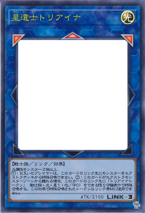 | 光属性モンスター2体以上 ①:お互いのプレイヤーは、このカードのリンク先にモンスターをエクストラデッキから特殊召喚できない。②:このカードがエクストラモンスターゾーンから離れる場合、このカードのリンク先に「トリアイナトークン」(戦士族・光・星1・攻/守0)をできる限り守備表示で特殊召喚する。この効果で特殊召喚されたトークンはリンク素材に使用できない。 | |||