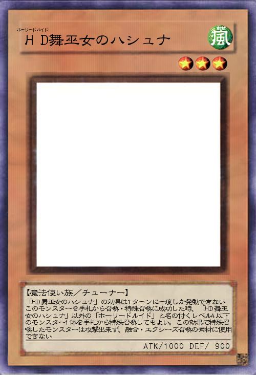 | 「HD舞巫女のハシュナ」の効果は1ターンに一度しか発動できない このモンスターを手札から召喚・特殊召喚に成功した時、「HD舞巫女のハシュナ」以外の「ホーリードルイド」と名の付くレベル4以下のモンスター1体を手札から特殊召喚してもよい。この効果で特殊召喚したモンスターは攻撃出来ず、融合・エクシーズ召喚の素材に使用できない | |||