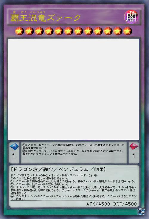 | ドラゴン族Pモンスターの融合・S・X・Pモンスター1体ずつ合計4体 このカードは融合召喚でしか特殊召喚できない。 ①:このカードが特殊召喚に成功した場合に発動する。相手フィールド・墓地のカードを全て除外する。 ②:このカードは他のカードの効果を受けない。 ③:1ターンに1度、モンスターの効果・魔法・罠カードが発動した時、又は相手がモンスターを召喚・反転召喚・特殊召喚した時に発動できる。デッキ・エクストラデッキから「覇王眷竜」モンスター1体を特殊召喚する。 ④:モンスターゾーンのこのカードがフィールドから離れた場合に発動できる。このカードを自分のPゾーンに置く。 | |||