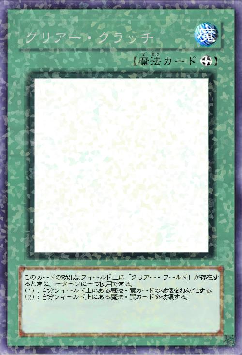 | このカードの効果はフィールド上に「クリアー・ワールド」が存在するときに、一ターンに一つ使用できる。 (1):自分フィールド上にある魔法・罠カードの破壊を無効化する。 (2):自分フィールド上にある魔法・罠カードを破壊する。 | |||