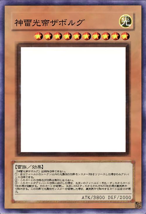 | 「神雷光帝ザボルグ」は特殊召喚できない。 ①:自分フィールドのトークン以外の光属性の効果モンスター3体をリリースした場合のみアドバンス召喚できる。 ②:このカードの召喚及び効果は無効とならない。 ③:このカードがアドバンス召喚に成功した場合、お互いのフィールド・手札・デッキからカード1枚を選び発動する。そのカードを破壊し、お互いのEXデッキからそれぞれ10枚を選び裏側表示で除外する。この効果で光属性モンスターを破壊した場合、裏側表示で除外するカードは自分が選ぶ。 | |||