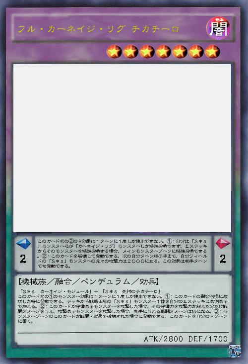 | 「S*s カーネイジ・モジュール」+ 「S*s 死神のチカチーロ」 このカード名の①のモンスター効果は1ターンに1度しか使用できない。①:このカードの融合召喚に成功した時に発動できる。デッキから獣戦士族の「S*s」モンスター1体を自分のEXデッキに表側表示で加える。②:このカードが守備表示モンスターを攻撃した場合、その守備力を攻撃力が超えた分だけ戦闘ダメージを与え、攻撃表示モンスターを攻撃した場合、相手に与える戦闘ダメージは倍になる。③:モンスターゾーンのこのカードが戦闘・効果で破壊された場合に発動できる。このカードを自分のPゾーンに置く。 | |||