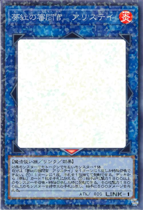| 効果モンスターでもトークンでもないモンスター1体 自分は「夢紅の審問官 アリステイ」を1ターンに1度しか特殊召喚できない。①:1ターンに1度、手札を1枚捨てて発動できる。デッキから「夢紅」カード1枚を手札に加える。②:相手が攻撃力1800以上のモンスターを召喚・特殊召喚した時に発動できる。その攻撃力1800以上のモンスターを持ち主の手札に戻し、相手に500ダメージを与える。 | |||