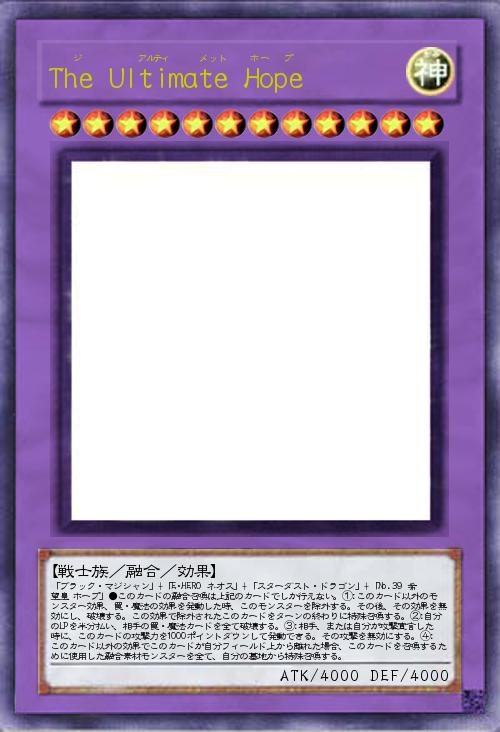 | 「ブラック・マジシャン」+「E・HERO ネオス」+「スターダスト・ドラゴン」+「No.39 希望皇 ホープ」●このカードの融合召喚は上記のカードでしか行えない。①:このカード以外のモンスター効果、罠・魔法の効果を発動した時、このモンスターを除外する。その後、その効果を無効にし、破壊する。この効果で除外されたこのカードをターンの終わりに特殊召喚する。②:自分のLPを半分払い、相手の罠・魔法カードを全て破壊する。③:相手、または自分が攻撃宣言した時に、このカードの攻撃力を1000ポイントダウンして発動できる。その攻撃を無効にする。④:このカード以外の効果でこのカードが自分フィールド上から離れた場合、このカードを召喚するために使用した融合素材モンスターを全て、自分の墓地から特殊召喚する。 | |||