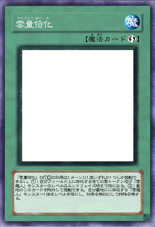 | 「雲量倍化」の①②の効果は1ターンに1度いずれか1つしか発動できない。①:自分フィールド上に存在する全ての雲トークン及び「雲魔人」モンスターのレベルはエンドフェイズ時まで倍になる。②:墓地のこのカードを除外して発動できる。自分墓地にに存在する「雲魔人」モンスター1体をレベルを倍にし、効果を無効にして特殊召喚する。 | |||