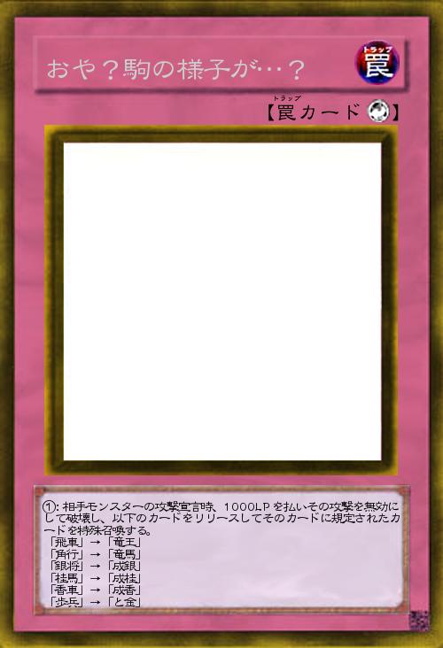 | ①:相手モンスターの攻撃宣言時、1000LPを払いその攻撃を無効にして破壊し、以下のカードをリリースしてそのカードに規定されたカードを特殊召喚する。 「飛車」→「竜王」 「角行」→「竜馬」 「銀将」→「成銀」 「桂馬」→「成桂」 「香車」→「成香」 「歩兵」→「と金」 | |||