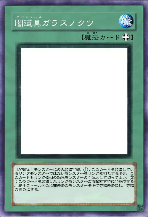 | 「闇御伽」モンスターにのみ装備可能。①:このカードを装備しているリンクモンスターではないモンスターをリンク素材とする場合、このカードもリンク素材の効果モンスターの1体として扱ってよい。②:このカードを装備したリンクモンスターの攻撃宣言時に発動できる。相手フィールドの攻撃表示のモンスターを全て守備表示にし、守備力を0にする。 | |||