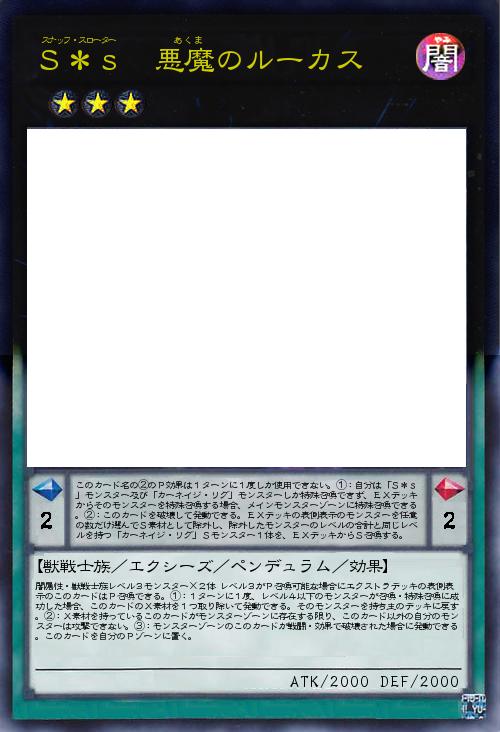 | このカード名の②のP効果は1ターンに1度しか使用できない。①:自分は「S*s」モンスター及び「カーネイジ・リグ」モンスターしか特殊召喚できず、EXデッキからそのモンスターを特殊召喚する場合、メインモンスターゾーンに特殊召喚できる。②:このカードを破壊して発動できる。EXデッキの表側表示のモンスターを任意の数だけ選んでS素材として除外し、除外したモンスターのレベルの合計と同じレベルを持つ「カーネイジ・リグ」Sモンスター1体を、EXデッキからS召喚する。 | |||