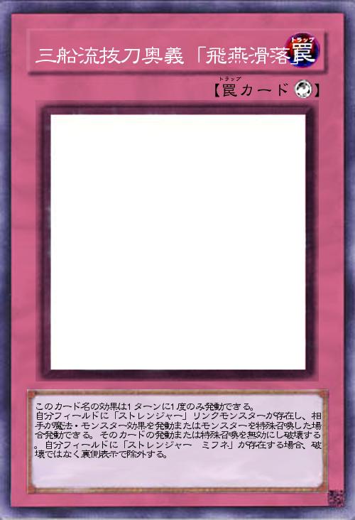 | このカード名の効果は1ターンに1度のみ発動できる。 自分フィールドに「ストレンジャー」リンクモンスターが存在し、相手が魔法・モンスター効果を発動またはモンスターを特殊召喚した場合発動できる。そのカードの発動または特殊召喚を無効にし破壊する。自分フィールドに「ストレンジャー ミフネ」が存在する場合、破壊ではなく裏側表示で除外する。 | |||