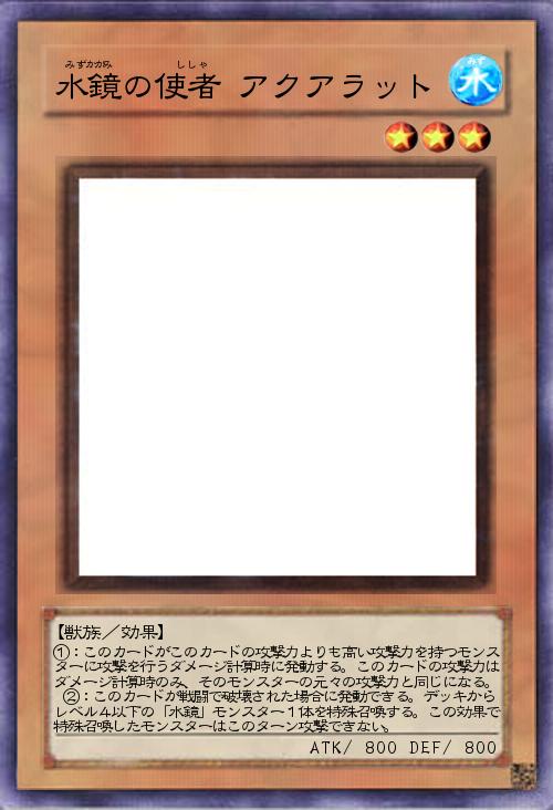 | ①:このカードがこのカードの攻撃力よりも高い攻撃力を持つモンスターに攻撃を行うダメージ計算時に発動する。このカードの攻撃力はダメージ計算時のみ、そのモンスターの元々の攻撃力と同じになる。 ②:このカードが戦闘で破壊された場合に発動できる。デッキからレベル4以下の「水鏡」モンスター1体を特殊召喚する。この効果で特殊召喚したモンスターはこのターン攻撃できない。 | |||