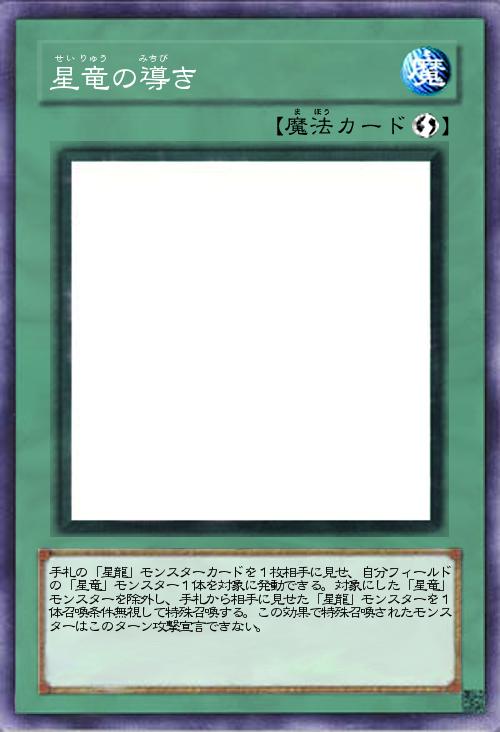 | 手札の「星龍」モンスターカードを1枚相手に見せ、自分フィールドの「星竜」モンスター1体を対象に発動できる。対象にした「星竜」モンスターを除外し、手札から相手に見せた「星龍」モンスターを1体召喚条件無視して特殊召喚する。この効果で特殊召喚されたモンスターはこのターン攻撃宣言できない。 | |||
