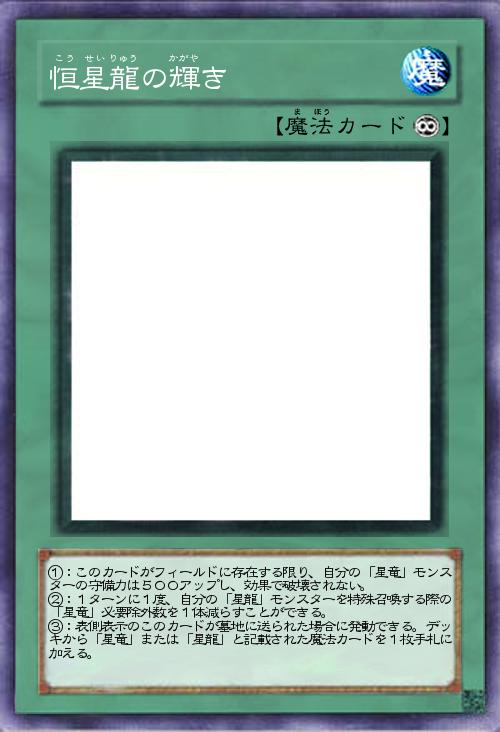 | ①:このカードがフィールドに存在する限り、自分の「星竜」モンスターの守備力は500アップし、効果で破壊されない。 ②:1ターンに1度、自分の「星龍」モンスターを特殊召喚する際の「星竜」必要除外数を1体減らすことができる。 ③:表側表示のこのカードが墓地に送られた場合に発動できる。デッキから「星竜」または「星龍」と記載された魔法カードを1枚手札に加える。 | |||