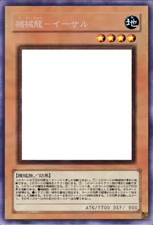 | このカードの①②の効果は1ターンに1度しか発動できない。①:このカードが機械族の場合に発動できる。このカードの種族をドラゴン族にする。②:このカードがドラゴン族の場合に発動できる。このカードの種族を機械族にする。③:1ターンに1度、このカードの種族によって以下の効果を発動できる。●機械族:相手フィールドのモンスター1体を対象として発動する。そのカードを破壊する。●ドラゴン族:相手の墓地に存在する、カードの効果で破壊されたモンスター1体を対象として発動する。そのモンスターを自分フィールドに特殊召喚する。この効果を発動したターン、そのモンスター以外の自分のモンスターは攻撃できない。 | |||
