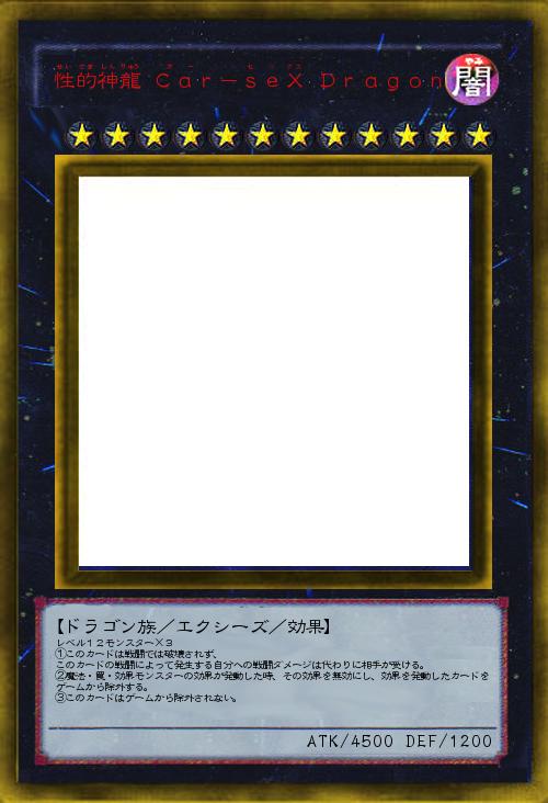 | レベル12モンスター×3 ①このカードは戦闘では破壊されず、 このカードの戦闘によって発生する自分への戦闘ダメージは代わりに相手が受ける。 ②魔法・罠・効果モンスターの効果が発動した時、その効果を無効にし、効果を発動したカードをゲームから除外する。 ③このカードはゲームから除外されない。 | |||