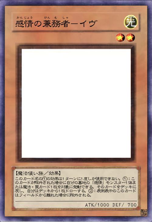 4体目は兼務者イヴ。除外された時に墓地の感情モンスターか、魔法・罠カードをデッキに戻すことで1枚ドローができます。除外されずに墓地へ行ってしまった感情モンスターを回収できる効果ですが、正直扱うのはなかなかに難しい感じ。