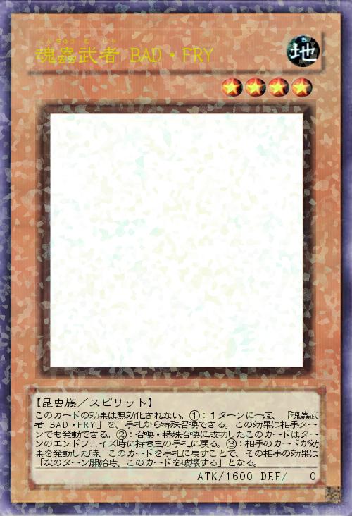 | このカードの効果は無効化されない。①:1ターンに一度、「魂蟲武者 BAD・FRY」を、手札から特殊召喚できる。この効果は相手ターンでも発動できる。②:召喚・特殊召喚に成功したこのカードはターンのエンドフェイズ時に持ち主の手札に戻る。③:相手のカードが効果を発動した時、このカードを手札に戻すことで、その相手の効果は「次のターン開始時、このカードを破壊する」となる。 | |||