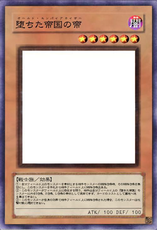 | ①:自分フィールド上のモンスターを素材とする相手モンスターの特殊召喚時、その特殊召喚を無効にし、このモンスターを手札から相手フィールド上に特殊召喚出来る。 ②:このモンスターがフィールド上に存在する限り、相手は自分フィールド上の「堕ちた帝国」モンスター以外をS召喚、X召喚、L召喚の素材として使用できず、カードのコストとして墓地へ送る事はできない。 ③:このモンスターが自身の効果で相手フィールド上に特殊召喚された場合、このモンスターは攻撃対象に選択できない。 | |||