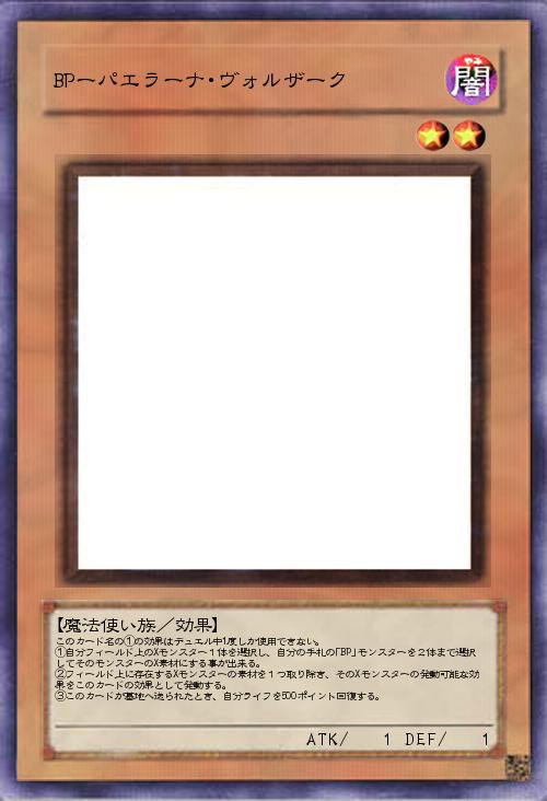 | このカード名の①の効果はデュエル中1度しか使用できない。 ①自分フィールド上のXモンスター1体を選択し、自分の手札の「BP」モンスターを2体まで選択してそのモンスターのX素材にする事が出来る。 ②フィールド上に存在するXモンスターの素材を1つ取り除き、そのXモンスターの発動可能な効果をこのカードの効果として発動する。 ③このカードが墓地へ送られたとき、自分ライフを500ポイント回復する。 | |||