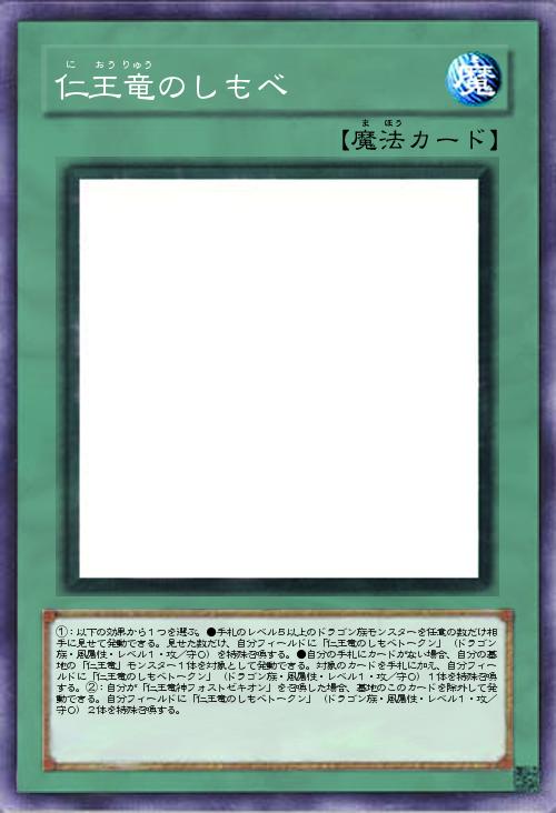 | ①:以下の効果から1つを選ぶ。●手札のレベル5以上のドラゴン族モンスターを任意の数だけ相手に見せて発動できる。見せた数だけ、自分フィールドに「仁王竜のしもべトークン」(ドラゴン族・風属性・レベル1・攻/守0)を特殊召喚する。●自分の手札にカードがない場合、自分の墓地の「仁王竜」モンスター1体を対象として発動できる。対象のカードを手札に加え、自分フィールドに「仁王竜のしもべトークン」(ドラゴン族・風属性・レベル1・攻/守0)1体を特殊召喚する。②:自分が「仁王竜神フォストゼキオン」を召喚した場合、墓地のこのカードを除外して発動できる。自分フィールドに「仁王竜のしもべトークン」(ドラゴン族・風属性・レベル1・攻/守0)2体を特殊召喚する。 | |||