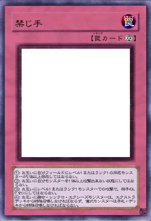| ①:お互いに自分フィールドにレベル1またはランク1の同名モンスターが2体以上存在してはならない。 ②:お互いに自分モンスターを1体以上攻撃出来ない状態にしてはならない。 ③:お互いにレベル1またはランク1モンスターでの攻撃で、相手のLPを0にしてはならない。 ④:お互いに融合・シンクロ・エクシーズモンスターは、エクストラデッキから特殊召喚しなければならず、儀式モンスターは手札・デッキから特殊召喚しなければならない。 | |||