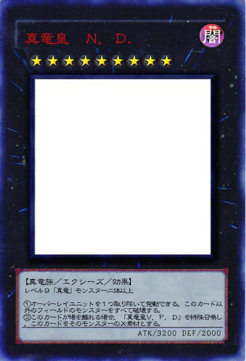 | レベル9「真竜」モンスター二体以上 ①オーバーレイユニットを1つ取り除いて発動できる。このカード以外のフィールドのモンスターをすべて破壊する。 ②このカードが場を離れる場合、「真竜皇V.F.D」を特殊召喚し、このカードをそのモンスターのX素材とする。 | |||