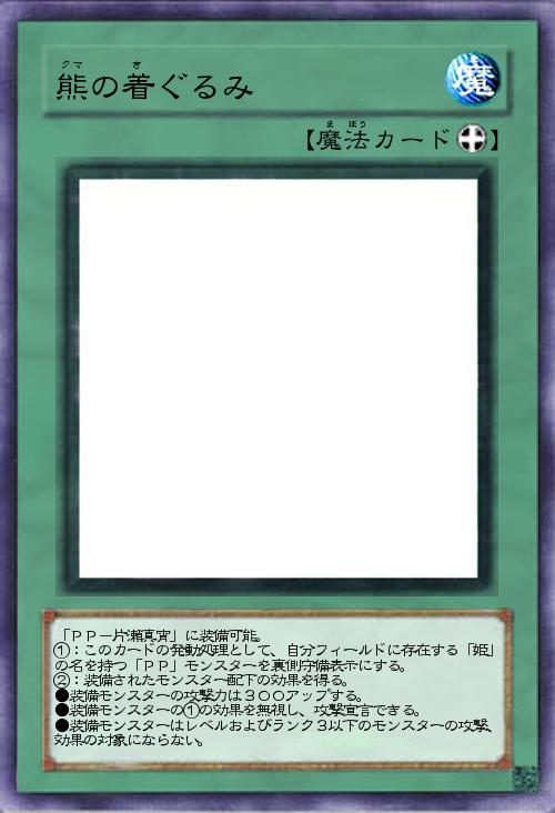 | 「PP-片瀬真宵」に装備可能。 ①:このカードの発動処理として、自分フィールドに存在する「姫」の名を持つ「PP」モンスターを裏側守備表示にする。 ②:装備されたモンスター配下の効果を得る。 ●装備モンスターの攻撃力は300アップする。 ●装備モンスターの①の効果を無視し、攻撃宣言できる。 ●装備モンスターはレベルおよびランク3以下のモンスターの攻撃、効果の対象にならない。 | |||