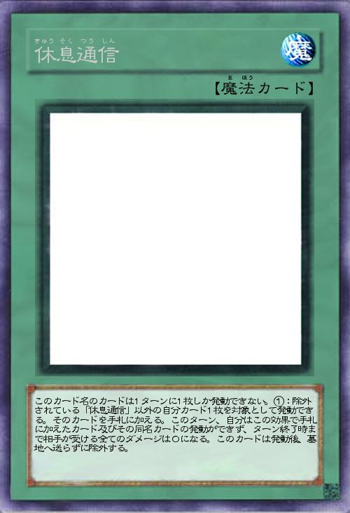 | このカード名のカードは1ターンに1枚しか発動できない。①:除外されている「休息通信」以外の自分カード1枚を対象として発動できる。そのカードを手札に加える。このターン、自分はこの効果で手札に加えたカード及びその同名カードの発動ができず、ターン終了時まで相手が受ける全てのダメージは0になる。このカードは発動後、墓地へ送らずに除外する。 | |||