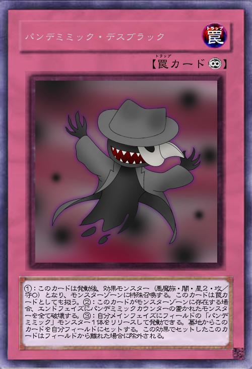 | ①:このカードは発動後、効果モンスター(悪魔族・闇・星2・攻/守0)となり、モンスターゾーンに特殊召喚する。このカードは罠カードとしても扱う。②:このカードがモンスターゾーンに存在する場合、エンドフェイズにパンデミミックカウンターの置かれたモンスターを全て破壊する。③:自分メインフェイズにフィールドの「パンデミミック」モンスター1体をリリースして発動できる。墓地からこのカードを自分フィールドにセットする。この効果でセットしたこのカードはフィールドから離れた場合に除外される。 | |||