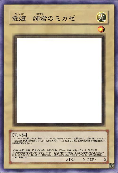 | このカードの攻撃力が0の場合、このカードは相手モンスターに攻撃できず、攻撃対象にされない(この効果が適用されたモンスターしか自分フィールドに存在しない状態での相手の攻撃は自分への直接攻撃になる)。 ____________________________________________ 《紫槻 美風》年齢:18歳/血液型:A型/身長:162cm/体重:43kg/B-W-H:84-53-79 ※清純令嬢を地で行く世にも珍しいキチンと文字通りのお嬢様。とは言え普通の学生とも交流があり、通う学校も一樹と同じ一般のもの。一樹とは幼い頃から知り合っており、彼の姉的存在として想いを寄せる。 | |||