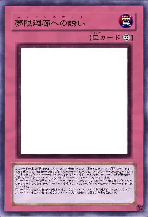 | このカードの③の効果はデュエル中1度しか発動できない。①自分のデッキから「BP」カードを5枚まで選択して、表側表示で相手プレイヤーのデッキに加える。相手プレイヤーがこのカードの①の効果で相手プレイヤーのデッキに加えられたカードをドローした時、そのカードを「夢限廻廊への誘い」カードをコントロールしているプレイヤーのフィールド上にセットする。 ②このカードの①の効果で相手プレイヤーのデッキに加えられていたカードが全て相手プレイヤーのデッキからなくなった時、このカードを破壊し、お互いのプレイヤーはデッキからカードを1枚ドローする。 ③このカードが自分の墓地に存在する場合、自分のドローフェイズ時に通常ドローを行う代わりに、このカードを自分の墓地から自分フィールド上に表側表示で置き、効果を発動する。 | |||
