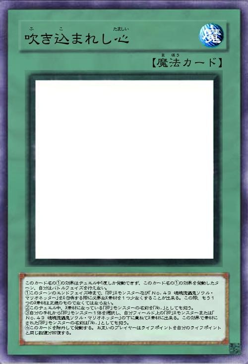 | このカード名の①の効果はデュエル中1度しか発動できず、このカード名の①の効果を発動したターン、自分はバトルフェイズを行えない。 ①このターンのエンドフェイズ時まで、「BP」Xモンスター及び「No.43 魂魄傀儡鬼ソウル・マリオネッター」をX召喚する際に必要なX素材を1つ少なくすることが出来る。この際、もう1つのX素材は正規のものでなくてはならない。 ②このデュエル中、X素材になっている「BP」モンスターの名前を「No.」としても扱う。 ③自分の手札から「BP」モンスター1体を選択し、自分フィールド上の「BP」Xモンスターまたは「No.43 魂魄傀儡鬼ソウル・マリオネッター」の下に重ねてX素材に出来る。この効果で素材にされた「BP」モンスターの名前は「No.」としても扱う。 ④このカードを除外して発動する。お互いのプレイヤーはライフポイントを自分のライフポイントと同じ数値分回復する。 | |||