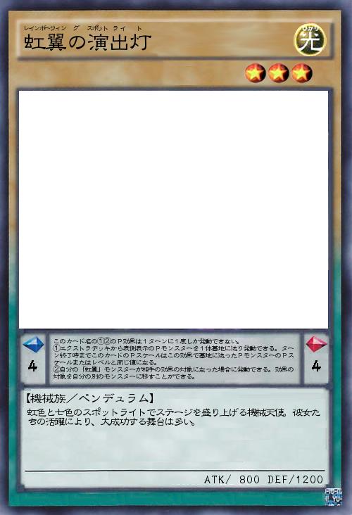 ルビの通り、「虹翼」は「レインボーウィング」の略です。虹色の光とEMを組み合わせた、光り輝くエンタメデュエルを主軸にしたデッキになってます。」(2017-05-07 19:02)
