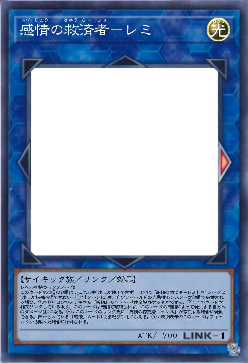 | レベルを持つモンスター1体 このカード名の③の効果はデュエル中1度しか使用できず、自分は「感情の救済者-レミ」を1ターンに1度しか特殊召喚できない。①:1ターンに1度、自分フィールドの光属性モンスターが効果で破壊される場合、代わりに自分のデッキから「感情」モンスター1体を除外する事ができる。②:このカードが相互リンクしている限り、このカードは戦闘で破壊されず、このカードの戦闘によって発生する自分へのダメージは0になる。③:このカードのリンク先に「感情の探究者-セシル」が存在する場合に発動できる。除外されている「感情」カード1枚を選び手札に加える。④:表側表示のこのカードはフィールドから離れた場合に除外される。 | |||