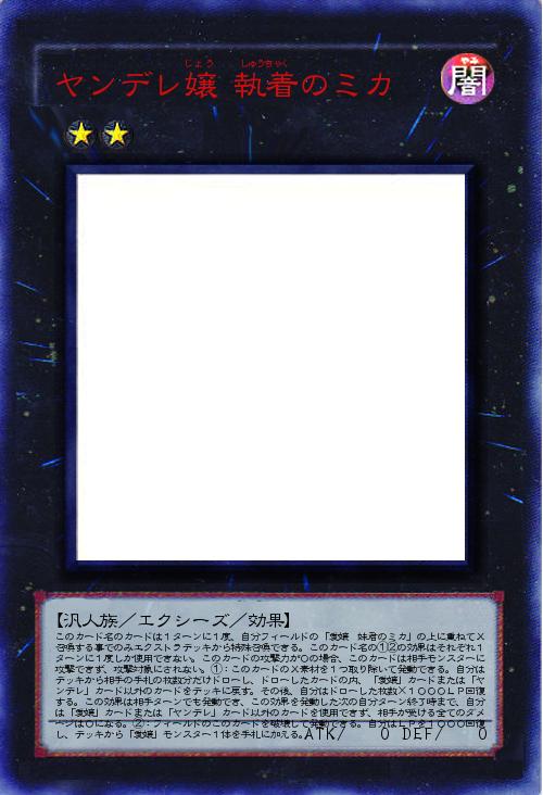 | このカード名のカードは1ターンに1度、自分フィールドの「愛嬢 妹君のミカ」の上に重ねてX召喚する事でのみエクストラデッキから特殊召喚できる。このカード名の①②の効果はそれぞれ1ターンに1度しか使用できない。このカードの攻撃力が0の場合、このカードは相手モンスターに攻撃できず、攻撃対象にされない。①:このカードのX素材を1つ取り除いて発動できる。自分はデッキから相手の手札の枚数分だけドローし、ドローしたカードの内、「愛嬢」カードまたは「ヤンデレ」カード以外のカードをデッキに戻す。その後、自分はドローした枚数×1000LP回復する。この効果は相手ターンでも発動でき、この効果を発動した次の自分ターン終了時まで、自分は「愛嬢」カードまたは「ヤンデレ」カード以外のカードを使用できず、相手が受ける全てのダメージは0になる。②:フィールドのこのカードを破壊して発動できる。自分はLPを1000回復し、デッ | |||