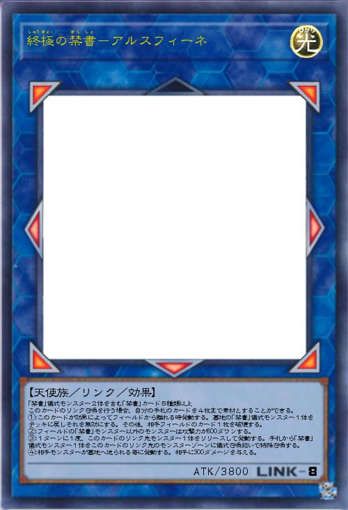 | 「禁書」儀式モンスター2体を含む「禁書」カード5種類以上 このカードのリンク召喚を行う場合、自分の手札のカードを4枚まで素材とすることができる。 ①:このカードが効果によってフィールドから離れる時発動する。墓地の「禁書」儀式モンスター1体をデッキに戻しそれを無効にする。その後、相手フィールドのカード1枚を破壊する。 ②:フィールドの「禁書」モンスター以外のモンスターは攻撃力が800ダウンする。 ③:1ターンに1度、このカードのリンク先モンスター1体をリリースして発動する。手札から「禁書」儀式モンスター1体をこのカードのリンク先のモンスターゾーンに儀式召喚扱いで特殊召喚する。 ④:相手モンスターが墓地へ送られる毎に発動する。相手に300ダメージを与える。 | |||
