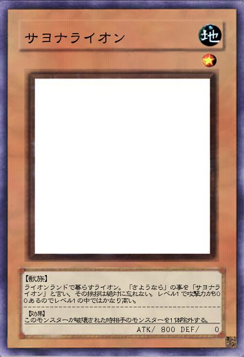 | ライオンランドで暮らすライオン。「さようなら」の事を「サヨナライオン」と言い、その挨拶は絶対に忘れない。レベル1で攻撃力が800あるのでレベル1の中ではかなり高い。 --------------------------------------------- 【効果】 このモンスターが破壊された時相手のモンスターを1体除外する。 | |||