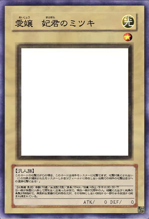 | このカードの攻撃力が0の場合、このカードは相手モンスターに攻撃できず、攻撃対象にされない(この効果が適用されたモンスターしか自分フィールドに存在しない状態での相手の攻撃は自分への直接攻撃になる)。 ____________________________________________ 《水無瀬 美月》年齢:19歳/血液型:B型/身長:164cm/体重:45kg/B-W-H:90-50-77 ※一樹が学園に入学して間もなく出逢った女性で、現在一樹が交際中の人。綺麗にたなびく純黒の長髪が特徴的で、典型的な高嶺の花的存在だが、その物怖じしない性格から一部の女子生徒から妬まれ疎まれている。 | |||