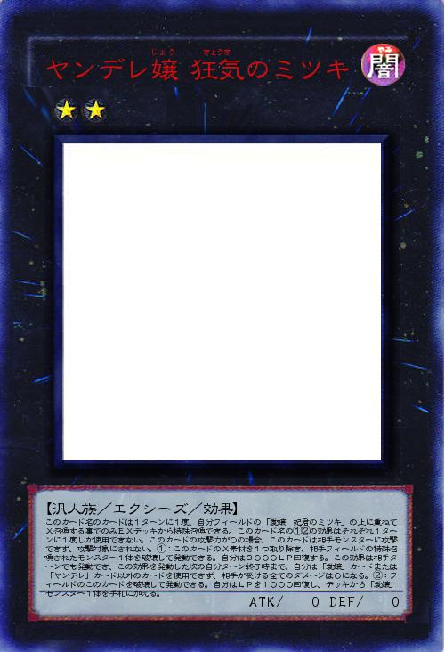 | このカード名のカードは1ターンに1度、自分フィールドの「愛嬢 妃君のミツキ」の上に重ねてX召喚する事でのみEXデッキから特殊召喚できる。このカード名の①②の効果はそれぞれ1ターンに1度しか使用できない。このカードの攻撃力が0の場合、このカードは相手モンスターに攻撃できず、攻撃対象にされない。①:このカードのX素材を1つ取り除き、相手フィールドの特殊召喚されたモンスター1体を破壊して発動できる。自分は3000LP回復する。この効果は相手ターンでも発動でき、この効果を発動した次の自分ターン終了時まで、自分は「愛嬢」カードまたは「ヤンデレ」カード以外のカードを使用できず、相手が受ける全てのダメージは0になる。②:フィールドのこのカードを破壊して発動できる。自分はLPを1000回復し、デッキから「愛嬢」モンスター1体を手札に加える。 | |||