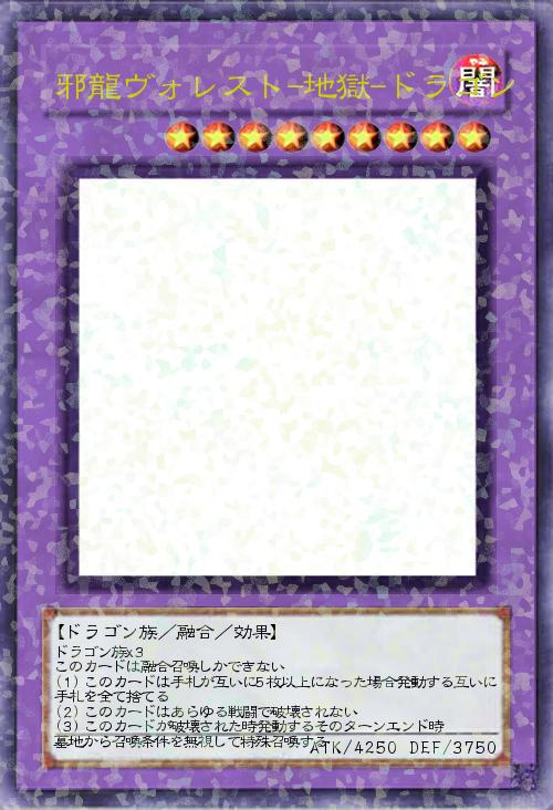 | ドラゴン族x3 このカードは融合召喚しかできない (1)このカードは手札が互いに5枚以上になった場合発動する互いに手札を全て捨てる (2)このカードはあらゆる戦闘で破壊されない (3)このカードが破壊された時発動するそのターンエンド時 墓地から召喚条件を無視して特殊召喚する | |||