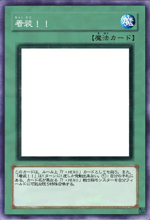 | このカードは、ルール上「T・HERO」カードとしても扱う。また、「着装!!」は1ターンに1度しか発動出来ない。①:自分の手札にある、カード名が異なる「T・HERO」戦士族モンスターを自分フィールドに可能な限り特殊召喚する。 | |||