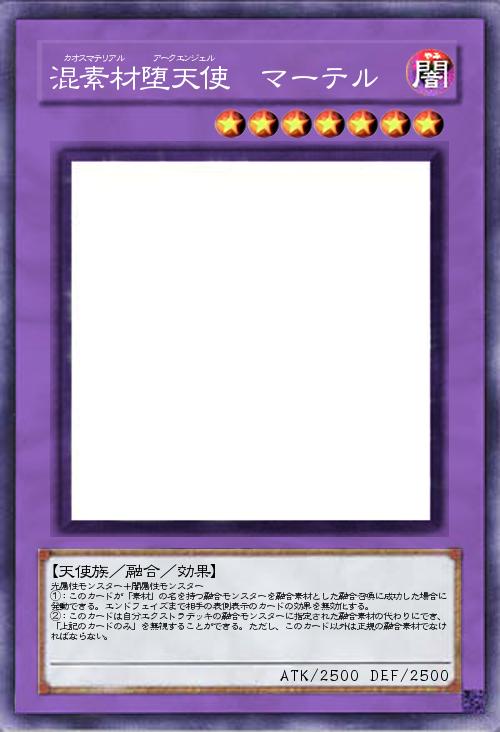 | 光属性モンスター+闇属性モンスター ①:このカードが「素材」の名を持つ融合モンスターを融合素材とした融合召喚に成功した場合に発動できる。エンドフェイズまで相手の表側表示のカードの効果を無効化する。 ②:このカードは自分エクストラデッキの融合モンスターに指定された融合素材の代わりにでき、「上記のカードのみ」を無視することができる。ただし、このカード以外は正規の融合素材でなければならない。 | |||