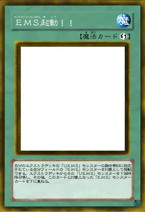 | 自分のエクストラデッキの「UEMS」モンスターの融合素材に指定されている自分フィールドの「EMS」モンスターを対象として発動できる。エクストラデッキからその「UEMS」モンスターを1体特殊召喚し、その後、このカードと対象となった「EMS」モンスターカードを下に重ねる。 | |||