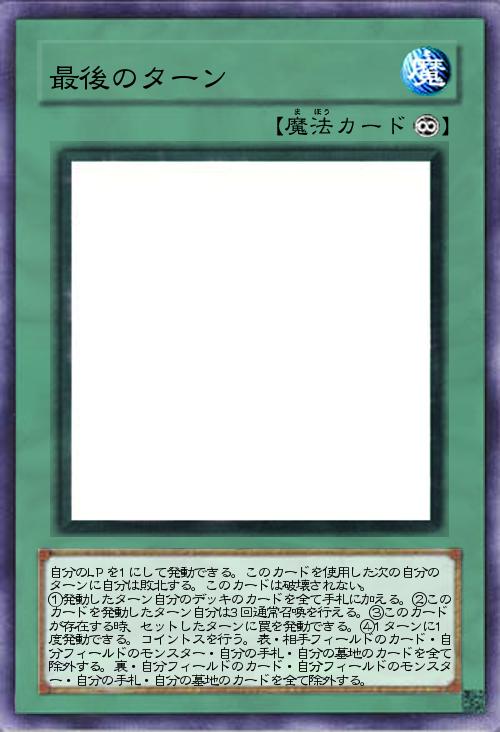 | 自分のLPを1にして発動できる。このカードを使用した次の自分のターンに自分は敗北する。このカードは破壊されない。 ①発動したターン自分のデッキのカードを全て手札に加える。②このカードを発動したターン自分は3回通常召喚を行える。③このカードが存在する時、セットしたターンに罠を発動できる。④1ターンに1度発動できる。コイントスを行う。表・相手フィールドのカード・自分フィールドのモンスター・自分の手札・自分の墓地のカードを全て除外する。裏・自分フィールドのカード・自分フィールドのモンスター・自分の手札・自分の墓地のカードを全て除外する。 | |||