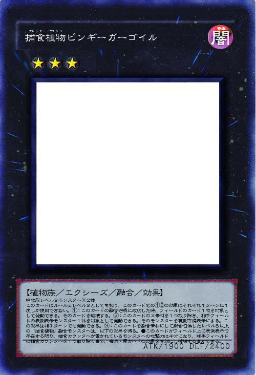 「やってまいりました捕食植物X!やはりプレプラのXはオフリス・ダーリングですぐ呼べるランク3がほしかったりしますね!と思ったら融合にも対応してる便利な子。合わさりしは、ムシトリスミレにガーゴイル…!勝手な想像だが、ガーゴイルの羽の部分が葉っぱになっててそこでくっついたやつをむしぁするに違いない…!後、謎の可愛さを求めるなら頭にムシトリスミレの花をつけてあげよう。ナニコレカワイイ(獲物を溶かしながら)。いっそのことその花に目でもつけるか…(提案)。