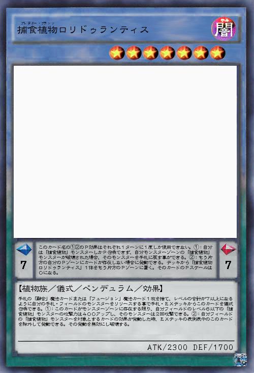 | このカード名の①②のP効果はそれぞれ1ターンに1度しか使用できない。①:自分は「捕食植物」モンスターしかP召喚できず、自分モンスターゾーンの「捕食植物」モンスターが破壊された場合、そのモンスターを手札に戻す事ができる。②:もう片方の自分のPゾーンにカードが存在しない場合に発動できる。デッキから「捕食植物ロリドゥランティス」1体をもう片方のPゾーンに置く。そのカードのPスケールは0になる。 | |||
