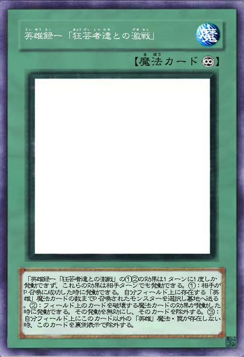 | 「英雄録ー「狂芸者達との激戦」の①②の効果は1ターンに1度しか発動できず、これらの効果は相手ターンでも発動できる。①:相手がP召喚に成功した時に発動できる。自分フィールド上に存在する「英雄」魔法カードの数までP召喚されたモンスターを選択し墓地へ送る。②:フィールド上のカードを破壊する魔法カードの効果が発動した時に発動できる。その発動を無効にし、そのカードを除外する。③:自分フィールド上にこのカード以外の「英雄」魔法・罠が存在しない時、このカードを裏側表示で除外する。 | |||
