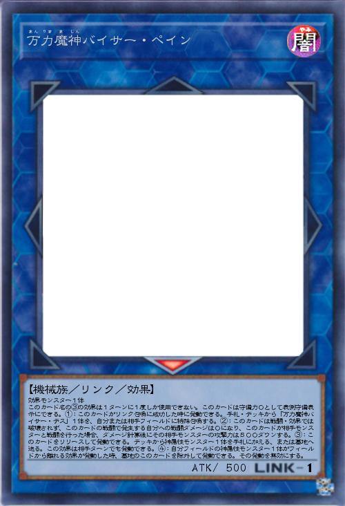 | 効果モンスター1体 このカード名の③の効果は1ターンに1度しか使用できない。このカードは守備力0として表側守備表示にできる。①:このカードがリンク召喚に成功した時に発動できる。手札・デッキから「万力魔神バイサー・デス」1体を、自分または相手フィールドに特殊召喚する。②:このカードは戦闘・効果では破壊されず、このカードの戦闘で発生する自分への戦闘ダメージは0になり、このカードが相手モンスターと戦闘を行った場合、ダメージ計算後にその相手モンスターの攻撃力は500ダウンする。③:このカードをリリースして発動できる。デッキから神属性モンスター1体を手札に加える、または墓地へ送る。この効果は相手ターンでも発動できる。④:自分フィールドの神属性モンスター1体がフィールドから離れる効果が発動した時、墓地のこのカードを除外して発動できる。その発動を無効にする。 | |||