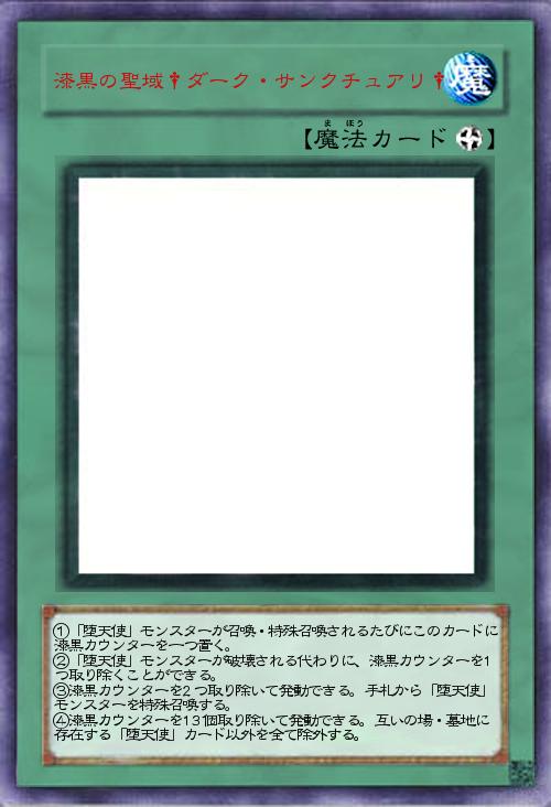 | ①「堕天使」モンスターが召喚・特殊召喚されるたびにこのカードに漆黒カウンターを一つ置く。 ②「堕天使」モンスターが破壊される代わりに、漆黒カウンターを1つ取り除くことができる。 ③漆黒カウンターを2つ取り除いて発動できる。手札から「堕天使」モンスターを特殊召喚する。 ④漆黒カウンターを13個取り除いて発動できる。互いの場・墓地に存在する「堕天使」カード以外を全て除外する。 | |||