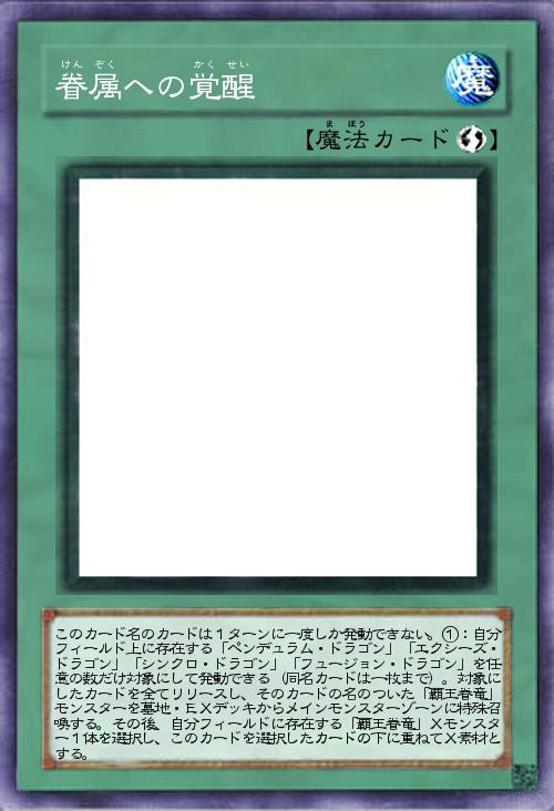 | このカード名のカードは1ターンに一度しか発動できない。①:自分フィールド上に存在する「ペンデュラム・ドラゴン」「エクシーズ・ドラゴン」「シンクロ・ドラゴン」「フュージョン・ドラゴン」を任意の数だけ対象にして発動できる(同名カードは一枚まで)。対象にしたカードを全てリリースし、そのカードの名のついた「覇王眷竜」モンスターを墓地・EXデッキからメインモンスターゾーンに特殊召喚する。その後、自分フィールドに存在する「覇王眷竜」Xモンスター1体を選択し、このカードを選択したカードの下に重ねてX素材とする。 | |||