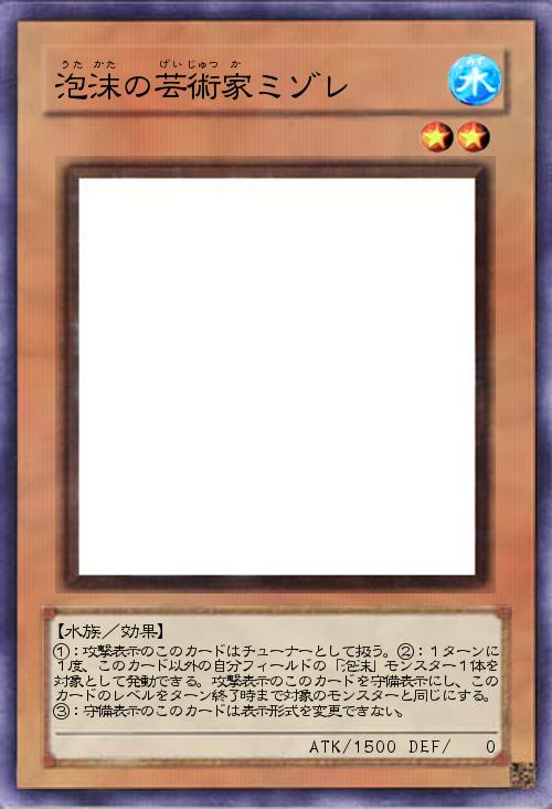 | ①:攻撃表示のこのカードはチューナーとして扱う。②:1ターンに1度、このカード以外の自分フィールドの「泡沫」モンスター1体を対象として発動できる。攻撃表示のこのカードを守備表示にし、このカードのレベルをターン終了時まで対象のモンスターと同じにする。③:守備表示のこのカードは表示形式を変更できない。 | |||